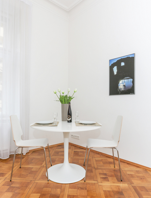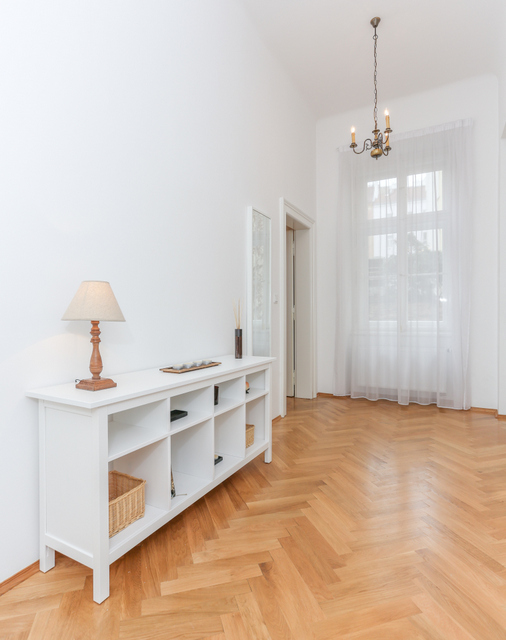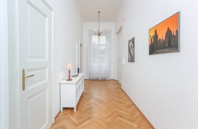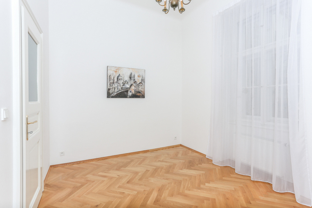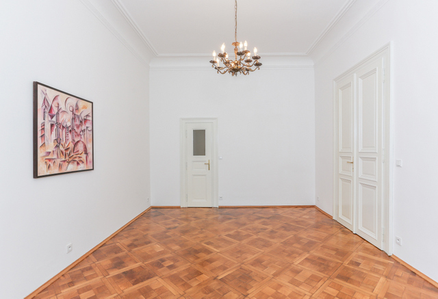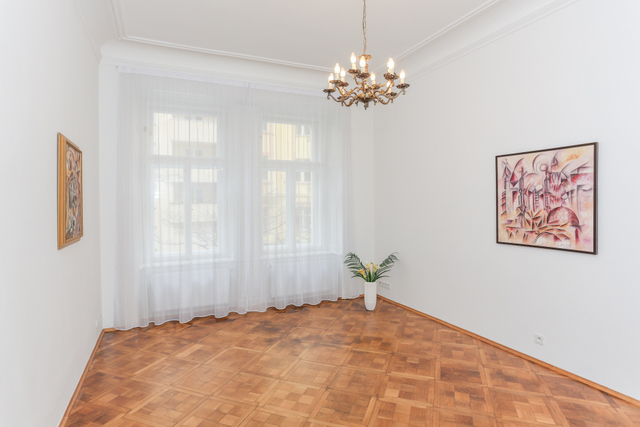 Příjemný nezařízený byt. Parkety, vysoké stropy, vybavená kuch. linka. 1.patro - výtah. Volný od listopadu 2025.